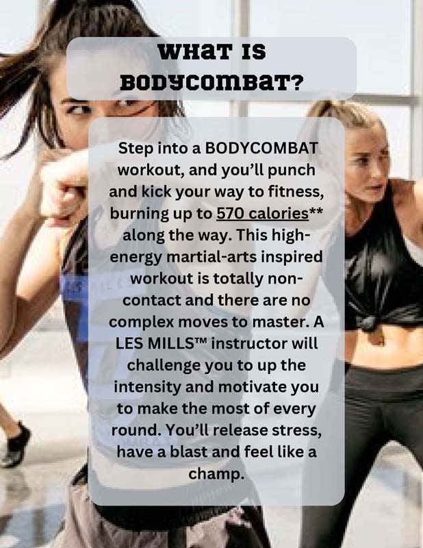 Step into a BODYCOMBAT workout, and you’ll punch and kick your way to fitness, burning up to 570 calories** along the way. This high-energy martial-arts inspired workout is totally non-contact and there are no complex moves to master. A LES MILLS™ instructor will challenge you to up the intensity and motivate you to make the most of every round. You’ll release stress, have a blast and feel like a champ.