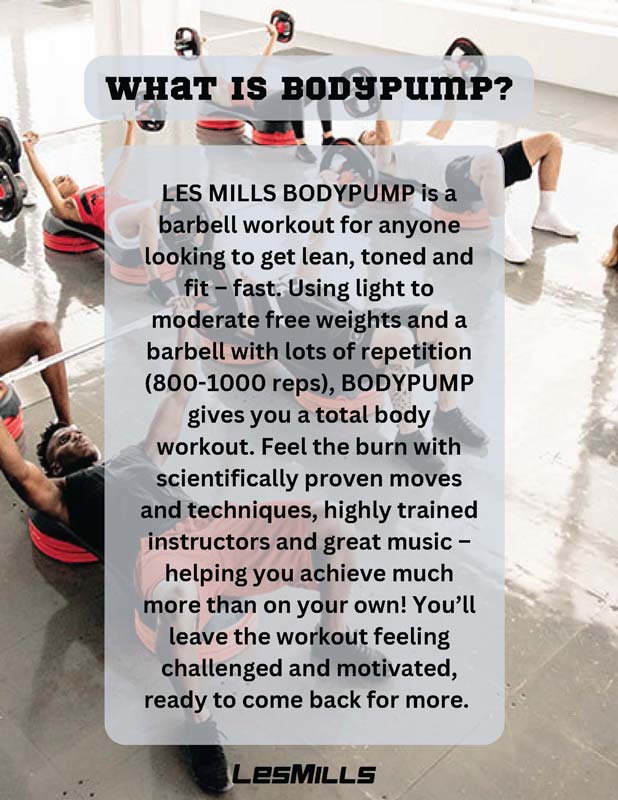 LES MILLS+ BODYPUMP™ is a full-body barbell workout for anyone looking to get lean, toned and fit – fast. Using light to moderate free weights and a barbell with lots of repetition (800-1000 reps), BODYPUMP gives you a total body workout. Feel the burn with scientifically proven moves and techniques, highly trained instructors and great music – helping you achieve much more than on your own! You’ll leave the workout feeling challenged and motivated, ready to come back for more.