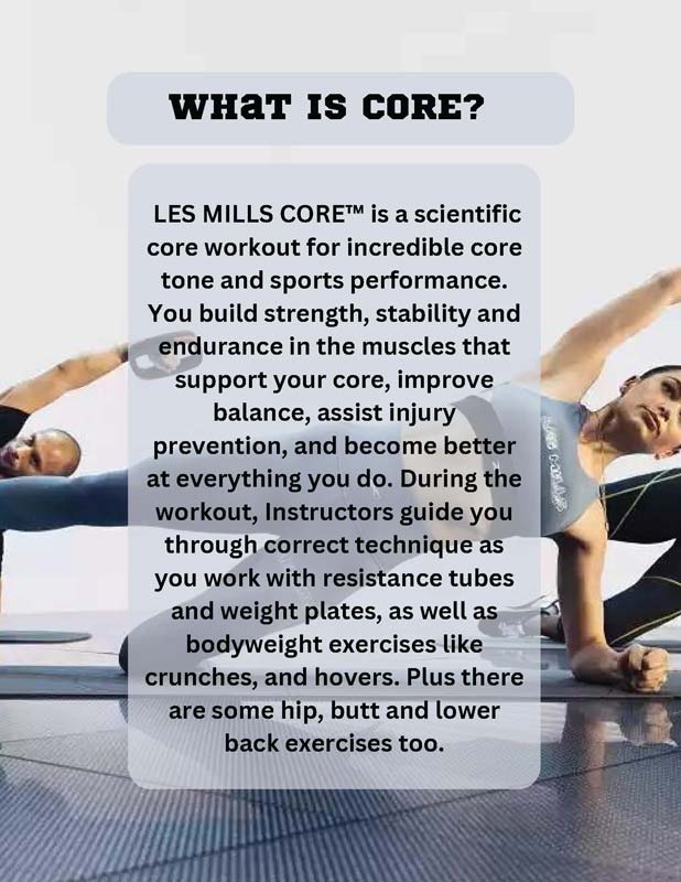 LES MILLS CORE™ is a scientific core workout for incredible core tone and sports performance. You build strength, stability and endurance in the muscles that support your core, improve balance, assist injury prevention, and become better at everything you do. During the workout, Instructors guide you through correct technique as you work with resistance tubes and weight plates, as well as bodyweight exercises like crunches, and hovers. Plus there are some hip, butt and lower back exercises too.