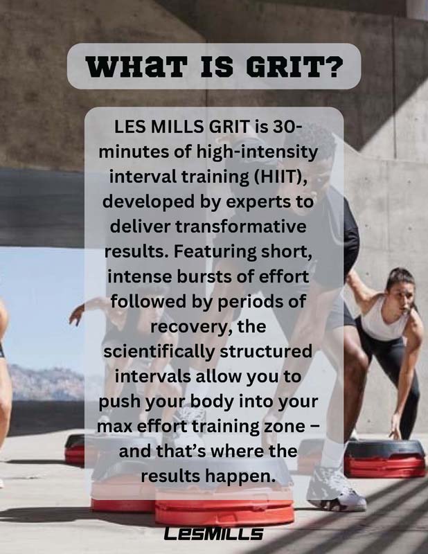 LES MILLS GRIT™ is a 30-minutes high-intensity interval training (HIIT) workout, developed by experts to deliver transformative results. Featuring short, intense bursts of effort followed by periods of recovery, the scientifically structured intervals allow you push your body into your max effort training zone – and that’s where the results happen.