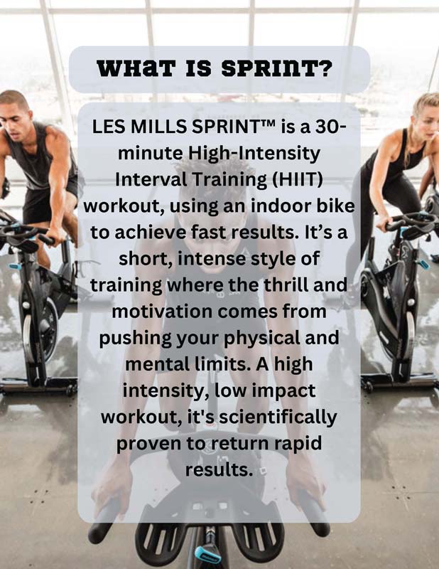 LES MILLS SPRINT™ is a 30-minute High-Intensity Interval Training (HIIT) workout, using an indoor bike to achieve fast results. It’s a short, intense style of training where the thrill and motivation comes from pushing your physical and mental limits. A high intensity, low impact workout, it's scientifically proven to return rapid results.