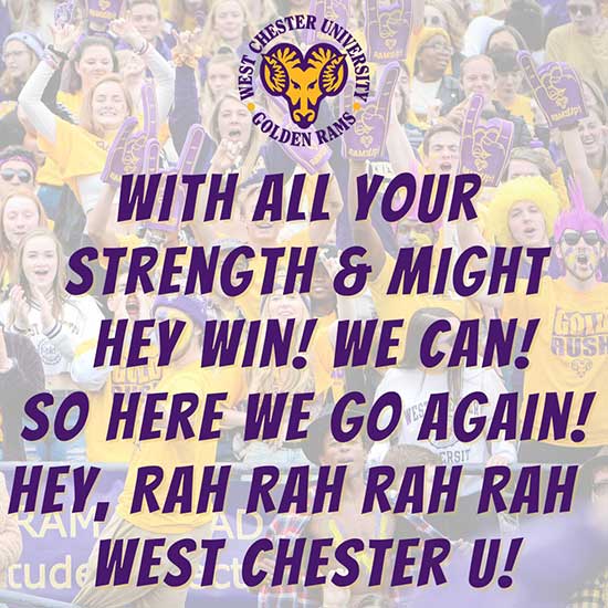 with all your strength & might hey win! we can! so here we go again hey, rah rah rah rah West Chester U
