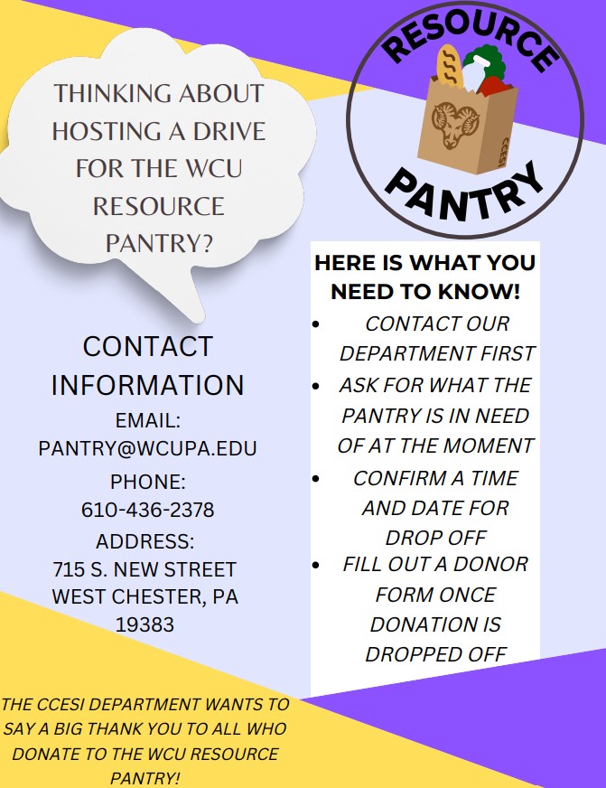 You can always reach out to the Resource Pantry at pantry@wcupa.edu and discuss with us your ideas and vision for collaboration. We love working with individuals who are passionate about eradicating food and basic need insecurity!