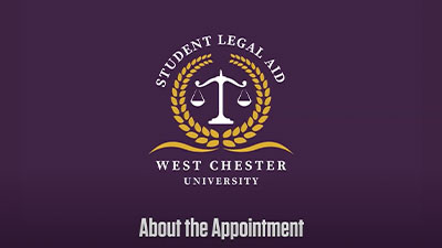 Currently enrolled West Chester University students can make an appointment on RamConnect to meet with a lawyer for free. Students are encouraged to bring documents to the designated appointment related to the legal issue (i.e., lease, citation). Please keep in mind that students are strongly encouraged to use this service BEFORE legal complications arise.