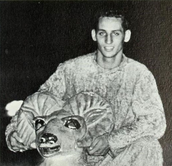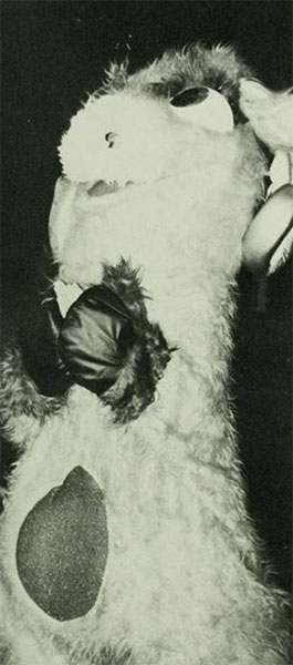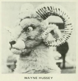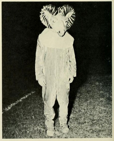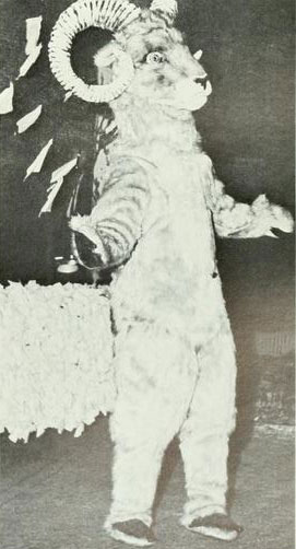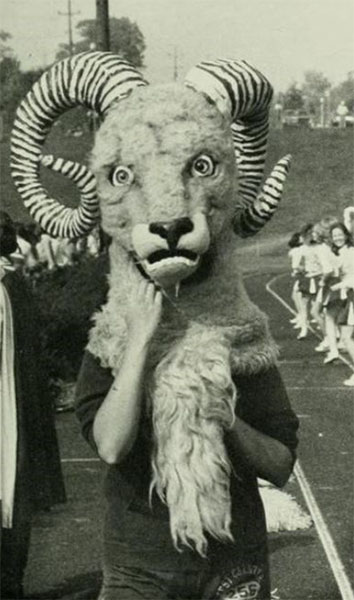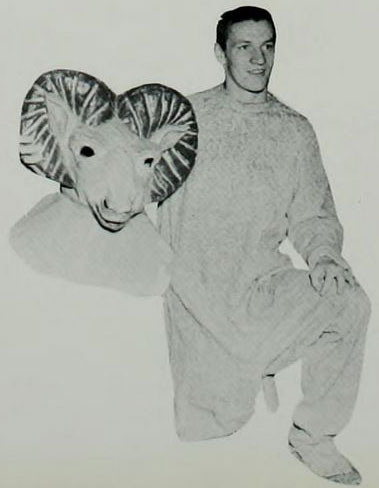 A new face appears (or is hidden by a "Ram's Head) when Wayne Hussey takes over the chores as official mascot. Perhaps inspired by the St. Joseph's College "Hawk", a complete Ram's costume is secured and Wayne will be a permanent fixture at all athletic and similar events to inspire support from the students. Several future opponents will attempt to steal the costume without removing Hussey from it. Today Wayne, writing from his teaching post in Alaska, recalls some of his narrow escapes. As President of the newly formed Booster Club, he will initiate new avenues of support for college activities which serves as the basis for current practices.