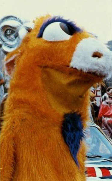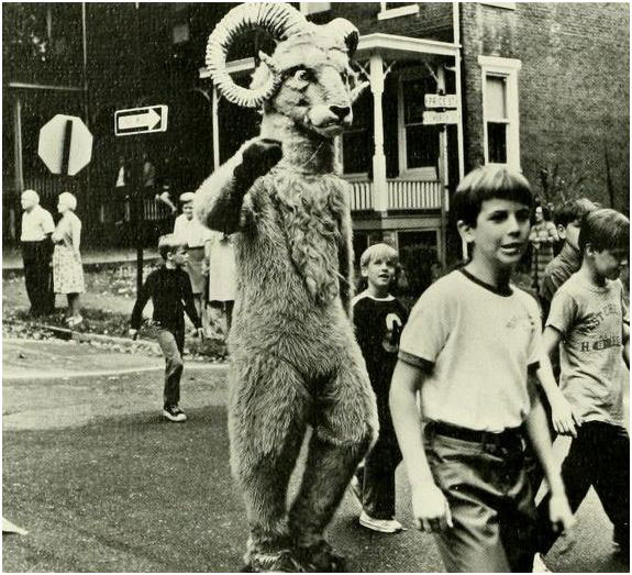 Dave Shuster dons the new Rams costume to lead the Rampage parade over town streets for the delight of spectators.