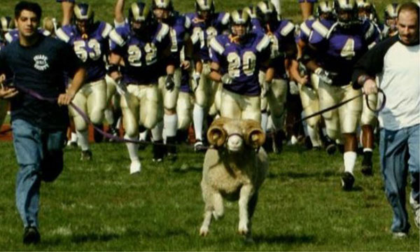 Rammy dances for the crowd in the Residential Quad. What would a game be without Rammy.