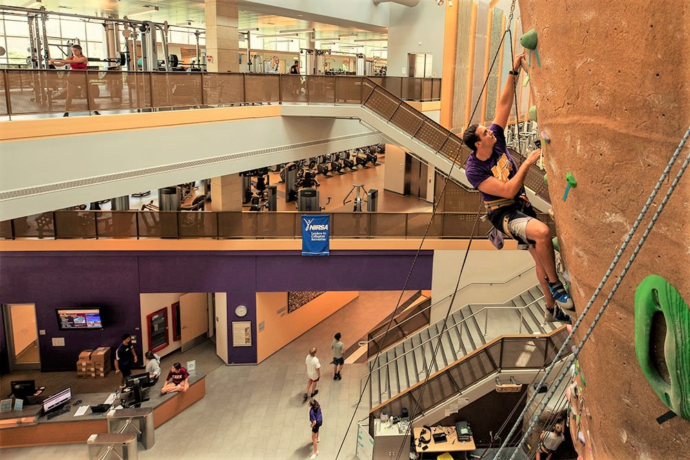 Basketball and racquetball courts, a rooftop yoga studio, daily workout classes, smoothie bar, exercise equipment and an indoor track are all waiting for you. And don’t forget to conquer the 34-foot rock climbing wall!