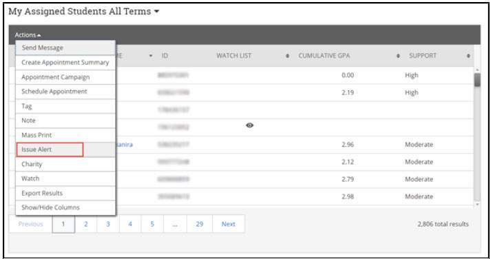 To issue an alert from a list of students, there are multiple ways to access this task. You can access the Advanced Search icon on your left navigation (magnifying glass), or from your My Assigned Students page on your home page. Select a student from the list. Next, select Actions > Issue Alert.