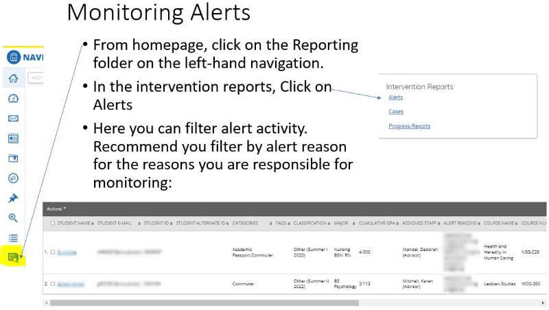 Monitoring Alerts - From homepage, click on the Reporting folder on the left-hand navigation. In the intervention reports, Click on Alerts. Here you can filter alert activity. Recommended you filter by alert reason for the reasons you are responsible for monitoring: