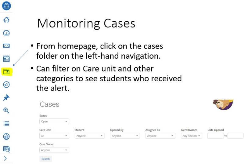 Monitoring Cases - From homepage, click on the cases folder on the left-hand navigation. Can filter on Care unit and other categories to see students who received the alert.
