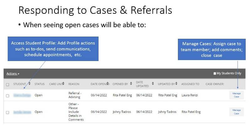 Responding to Cases & Referrals - when seeing open cases, you will be able to: Access Student Profile: Add Profile actions such as to-dos, send communications, schedule appointments, etc. Manage Cases: Assign case to team members; add comments; close cases.