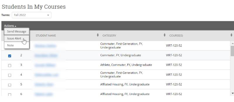 You can issue an alert for any student by using the I want to…Action.