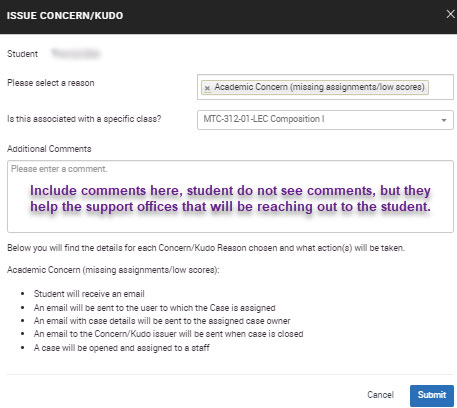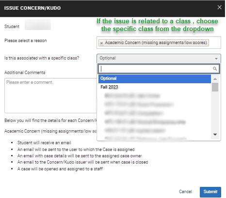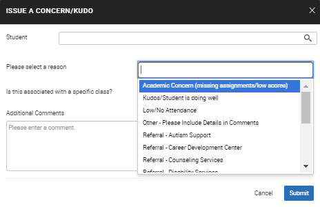 Select the reason for the Alert, Kudo, or Referral. Leave Is associated with Class? empty if the student is not in your current roster. Add your comment and submit the alert.