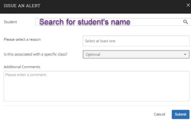 When you click on Issue an Alert you can search for any student.