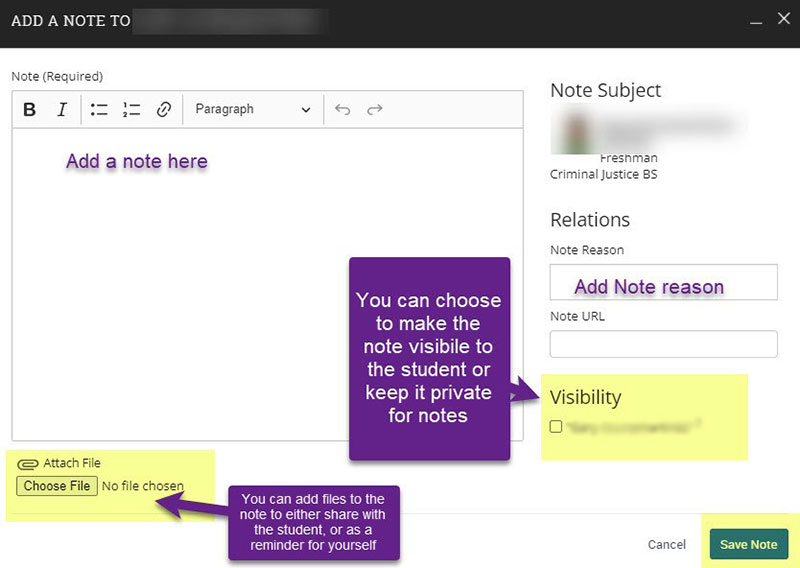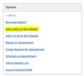 Who: Staff and faculty can use notes to document information about a student that may not be specific to an appointment or visit. Staff and faculty can make a note visible to the student or choose the option of keeping the note private, which means it can only be seen by staff and faculty.