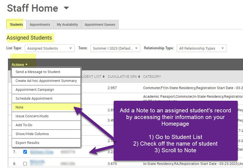 Yes! Notes can be added to more than one student at the same time. There is a cap of 100 students for whom notes can be added to at once. This can be done by selecting students in your queue (e.g. Advanced Search) and selecting the "Actions" menu. With the proper permissions, users can click "Note" to add a note to anywhere from 1 to 100 students. If more than one student is selected, the same note scripting will apply to each student record. If more than 100 students are in your queue and selected, the "Note" option will no longer appear within the "Actions" menu.