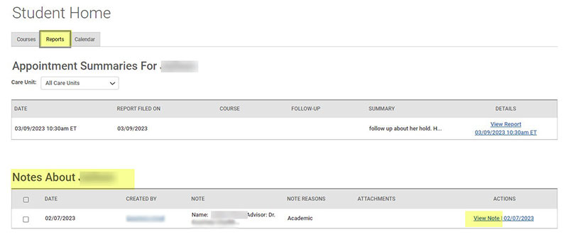 Student View on a computer (Advisor checked off Visibility for this student when creating the Note)