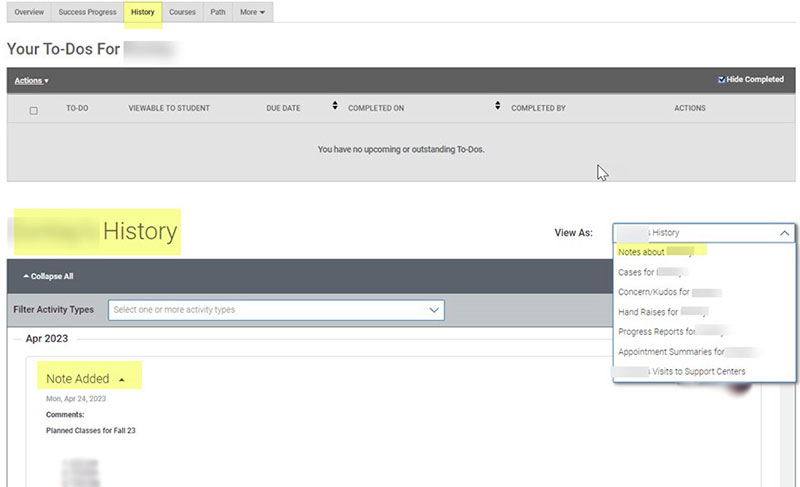 On the Student Profile page, click on the History Tab. Select Note About XX in the History filters View As dropdown, as shown below.
