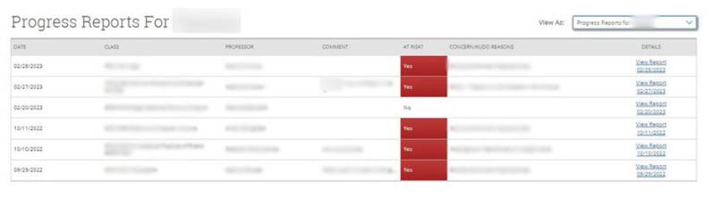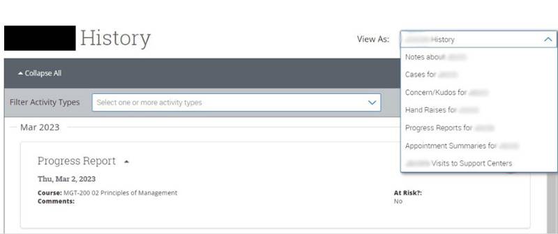 Each communication or action within Navigate is part of the student’s history tab. To view the various components such as notes, progress reports, and concerns and cases as a group, click on “View As” on the History tab.