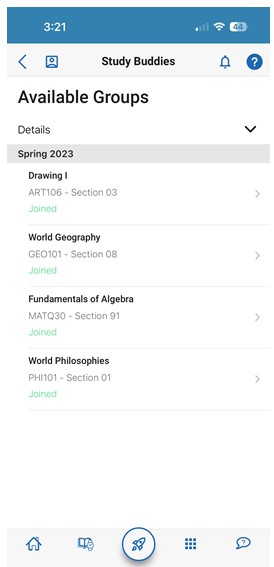 After opening Study Buddies, students see a list of class sections they are currently enrolled in. Each section shows how many buddies are in the group and if the student has already joined the group.