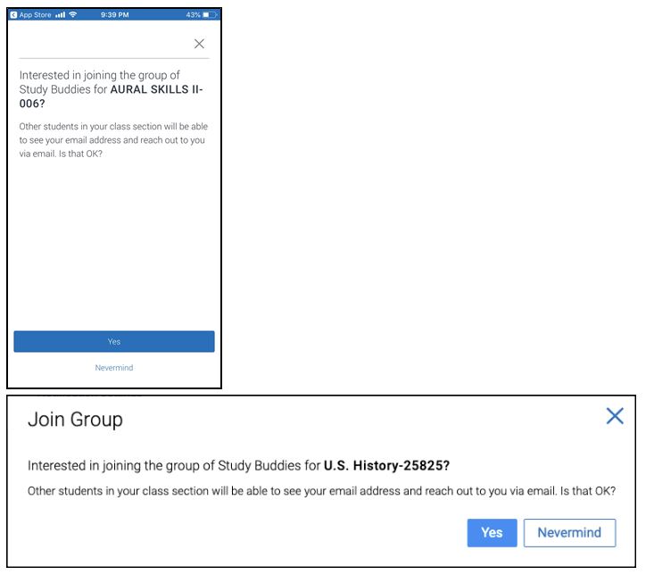Selecting Nevermind prevents the student from seeing or connecting with others through Study Buddies. Other students in the class cannot see the student's name or email address if they select Nevermind.