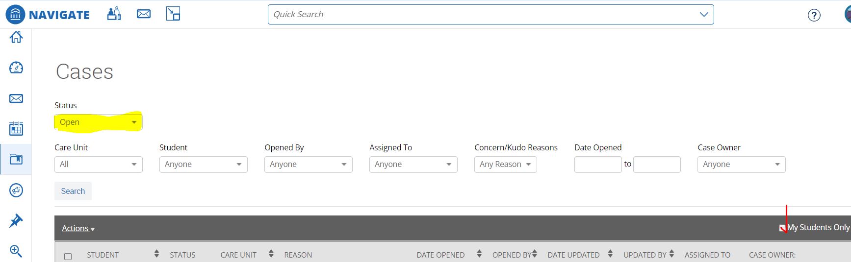 2. Check off “My Students Only” if you just want to see the students you have a relationship. Otherwise, you will see all cases assigned to your care unit. Use Filters to customize the cases you want to view.
