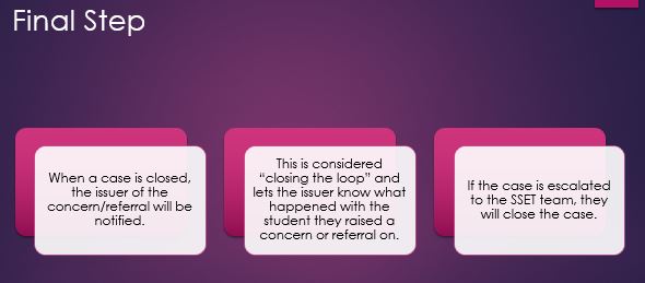 Final No response from  student, yet issues still exist. Case owners review case, possibly refer to Coordinated Care if the case involves  academic support  issues.  When closing the case the assignee will make final notes in the case comments and check off   "Allow closed comments to be shown in email."  This will provide and outcome for the faculty/staff member who raised the concern.