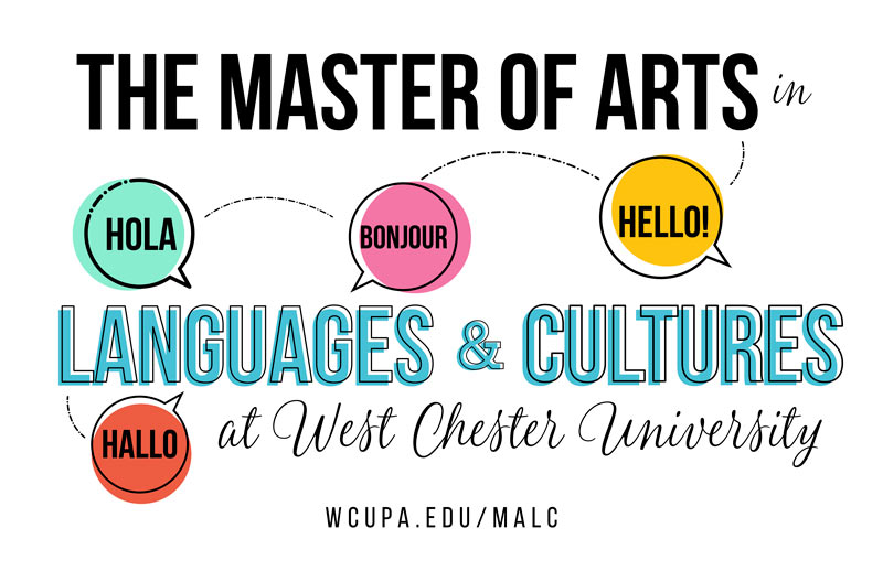 Enhance your knowledge and understanding of global languages with a Master of Arts in Languages and Cultures. The M.A. in Languages and Cultures at West Chester University features a dynamic curriculum that prepares graduates for a wide array of career opportunities through specializations in French, German, or Spanish as well as a vibrant community-centered intellectual environment. Options to pursue Pennsylvania K-12 Teaching Certification or an ESL Certificate are also offered.