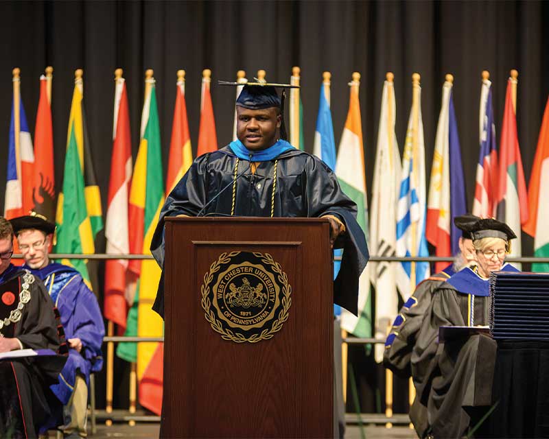 Amah Dunor had the unique distinction of being the student speaker at two of the University’s three graduate-level commencement ceremonies this year: one for the graduate-degree candidates at the Philadelphia site and one on main campus for graduates of the College of Business & Public Management. On Saturday, May 11, he and his family and guests had just enough time to celebrate in Philadelphia after the 12 p.m. ceremony before coming to West Chester for the 6 p.m. ceremony.