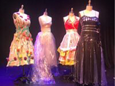 Both the performance piece and the exhibit were created to increase awareness of sustainability issues and spark community action. A “big top” tent is made from thousands of plastic bags, and costumes are made from plastic bags, soda cans, hula hoops, bottle caps and repurposed clothing.