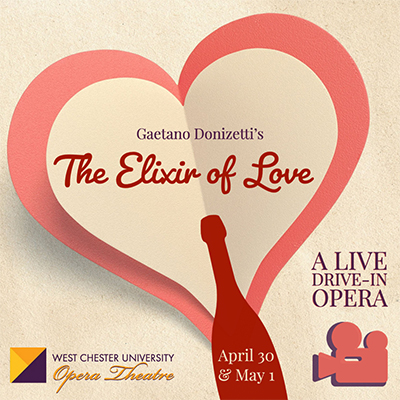 Wells School of Music Opera students at West Chester University are up for a new challenge this year – performing a drive-in opera. On Saturday, May 1 and Sunday, May 2 at 8:30 p.m., Wells School of Music’s Opera Theatre presents Gaetano Donizetti’s The Elixir of Love (L’elixir d’amore.) The performance will be staged in the parking lot of the Madeleine Wing Adler Theatre of the Swope Music Building and Performing Arts Center, 817 S. High Street, West Chester. Tickets are FREE but reservations are required due to the limited number of parking spaces available. The first performance was originally scheduled for Friday, April 29, but was postponed to Sunday, May 2, due to high winds. For more information or to reserve a parking spot visit www.wcupatix.com.