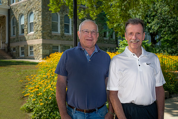 Demonstration School alumni Charlie Spadoni, left, and Bill Young, at Ruby Jones Hall, site of the school for much of its history.