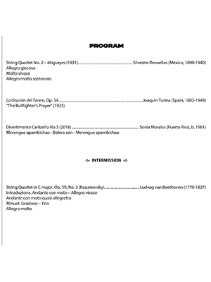 The Dalí Quartet is acclaimed for bringing Latin American quartet repertoire to an equal standing alongside the Classical and Romantic canon. Tours of this award-winning ensemble’s Classical Roots, Latin Soul have reached enthusiastic audiences across the United States, Canada, and South America. The Dalí Quartet is the 2021 recipient of the Guarneri String Quartet Residency, funded by the Sewell Family Foundation, and the 2021 Silver Medal at the inaugural Piazzolla Music Competition. The quartet is also the 2019 recipient of the Atlanta Symphony’s esteemed Aspire Award for the accomplished African American and Latino Musicians. They founded the much-admired Dalí Quartet International Music Festival in 2004 which develops the performance skills of musicians through semi-professional level. Currently, Dalí Quartet is in residence at West Chester University, is an Iris Orchestra Resident Ensemble, has served as a resident ensemble at Lehigh University, and given mini residencies at colleges and university in the U.S. and Canada. Members of the Dalí Quartet are from Venezuela, Puerto Rico, and the U.S.