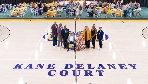 The Kane DeLaney Court features the two coaches’ signatures, permanent hanging banners with images of the honorees, and new wall paint that blazes purple and gold Ram pride. The newly designed Kane DeLaney Court has been made possible thanks to 180 gifts made by West Chester University alumni and friends.