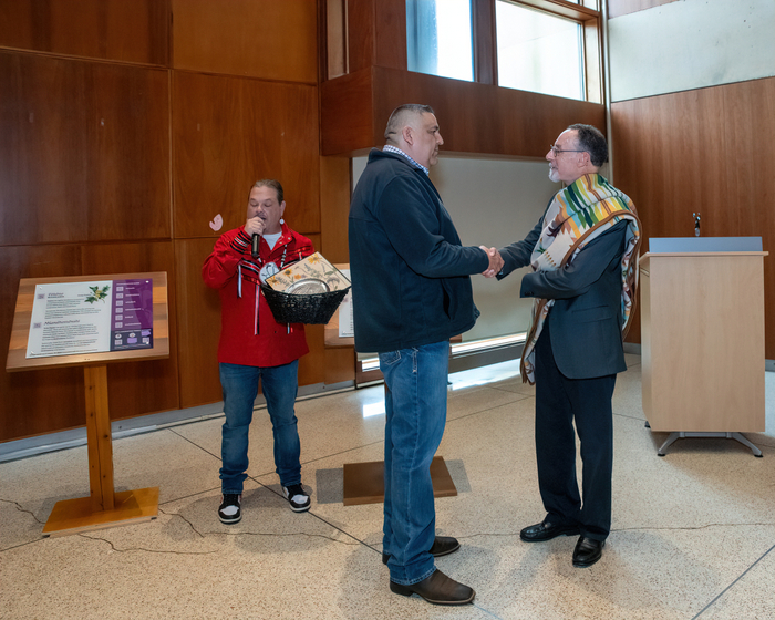 Representatives of the Delaware Tribe of Indians, Mr. Jeremy Johnson (left) and Chief KillsCrow (center) exchange gifts with Christopher Fiorentino