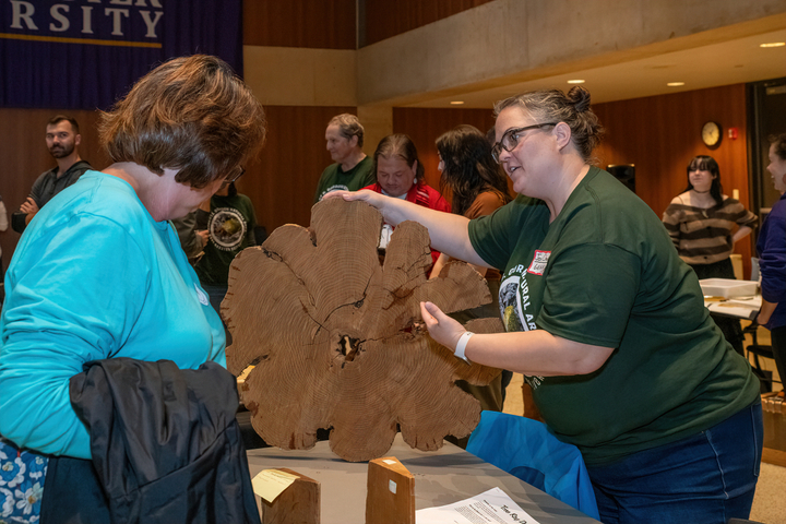 Dr. Jennifer Chandler (Department of Biology) discusses the finer points of tree rings with a Forest Festival participant