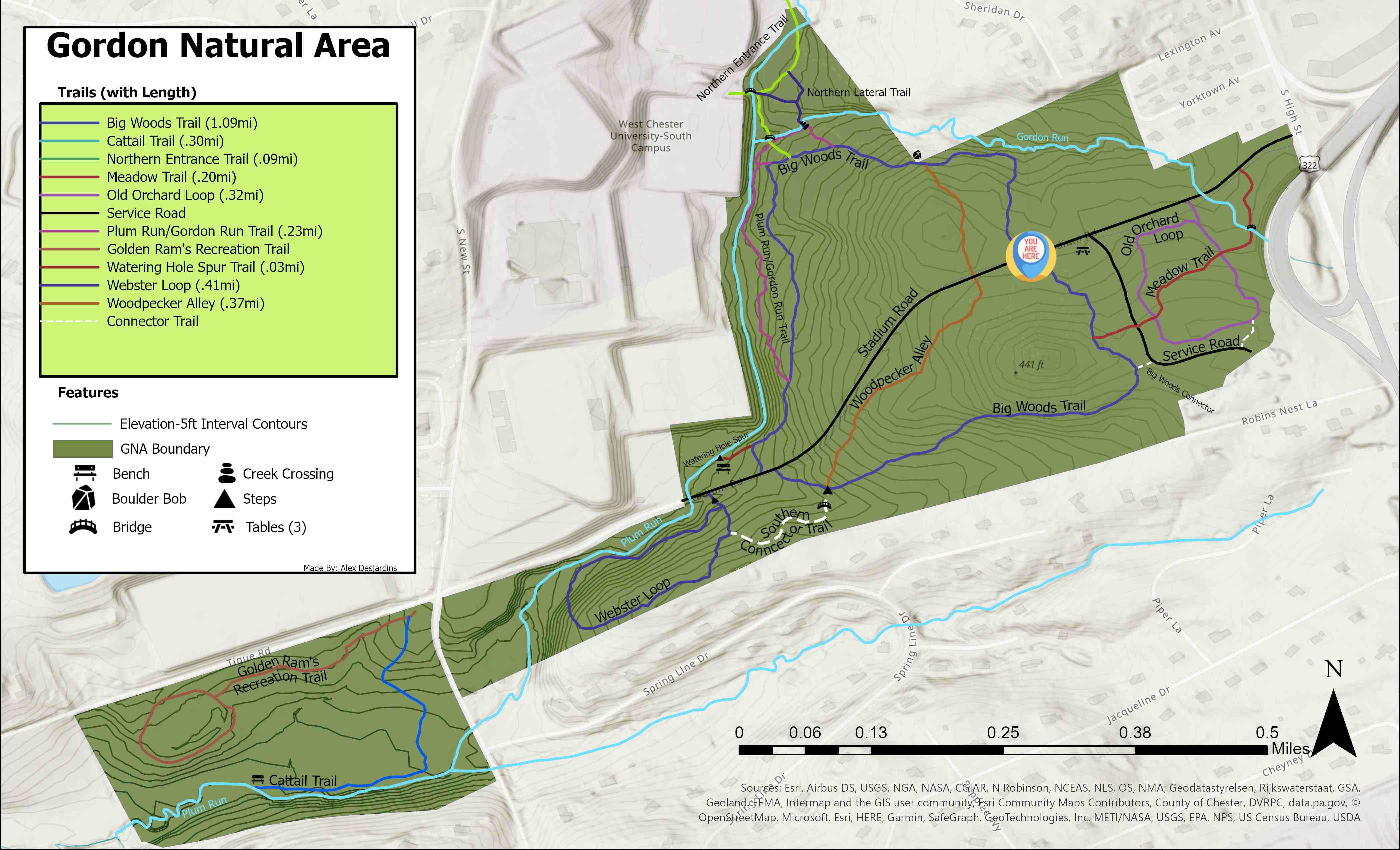 This is the intersection of the Big Woods trail with Stadium Road! This marks about the halfway mark of the trail, with the north and south parts of the trail both looping around and heading east. Continuing down stadium road to the west is the entrance to the Meadow trail and the Old Orchard Loop.