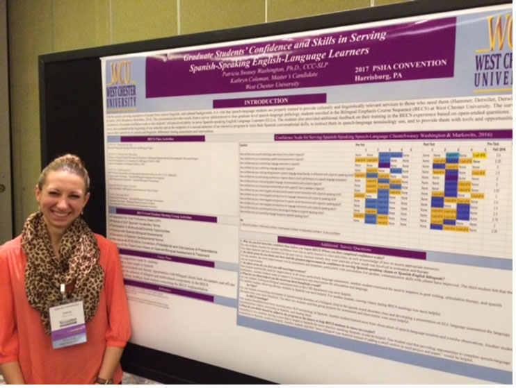A second area of research involves assessing and increasing the cultural and linguistic competence of undergraduate and graduate students who are engaged in the Bilingual Emphasis Course Sequence (BECS) (a component of the speech-language pathology graduate program) (Swasey Washington, 2012, BECS founder and director). BECS students participate in international clinical, cultural, and classroom opportunities. Results of self-rating of confidence levels in using Spanish on various speech-language tasks showed that students felt they improved on most tasks after one semester enrolled in the BECS (Swasey Washington & Coleman, 2017, poster presentation at the Pennsylvania Speech-Language-Hearing Association (PSHA) Convention). This information is used to inform the BECS and at the same time elevate the level of services provided to the community.