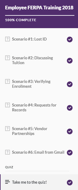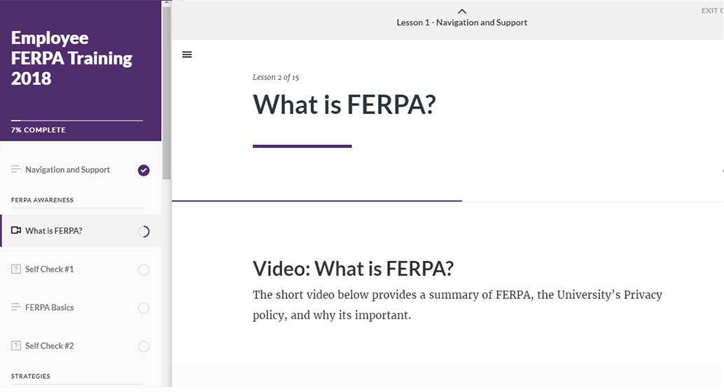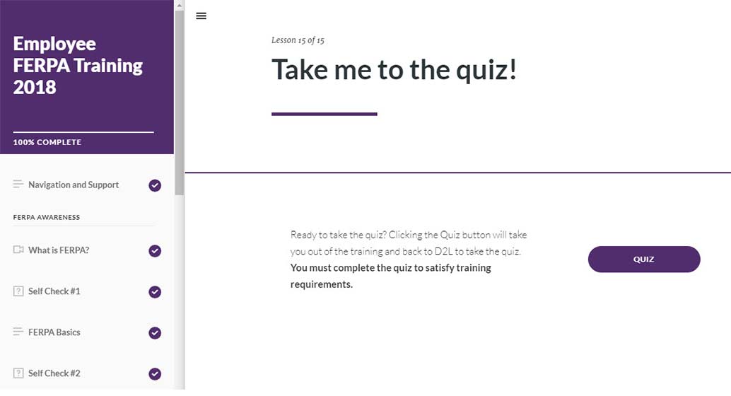 All employees must complete the FERPA training. The online and self-paced courses are administered through D2L and were developed using D2L, Articulate, Camtasia, GoAnimate, Canva, and PeopleSoft. Employees can start and leave the course as often as needed and both conclude with a quiz at the end.