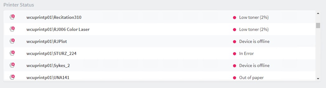 This cost effective and easy to use tool is installed and maintained on a print server by the IS&T Tech Fee staff. There are 116 university owned network printers installed throughout campus for student use. These networked printers communicate with the PaperCut product for reporting and management purposes. Tech Fee staff can monitor the printer status remotely which is useful for troubleshooting, as it provides the status on printer activity, paper jams, toner level, and if the paper tray is empty. The print queues can be quickly monitored and cleared by the Tech Fee and Help Desk staff for continued operations.