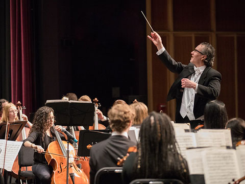 The West Chester University Symphony Orchestra (WCUSO) offers musicians from the Wells School of Music (WSOM) and the broader West Chester University student community the opportunity to develop their technical playing, musicianship, and artistry through the study of standard and contemporary orchestral repertoire and seven to eight performances each year. On many occasions, the WCUSO is joined by soloists including WSOM faculty members, student winners of the annual Concerto Competition, and internationally renowned guest artists. A listing of sample past and future programs can be found below. Click on past programs to access recordings.