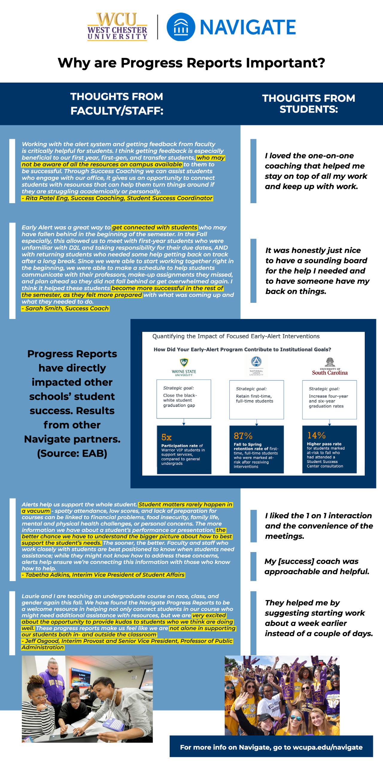 • Laurie and I are teaching an undergraduate course on race, class, and gender again this fall. We have found the Navigate Progress Reports to be a welcome resource in helping not only connect students in our course who might need additional assistance with resources, but we are very excited about the opportunity to provide kudos to students who we think are doing well. These progress reports make us feel like we are not alone in supporting our students both in- and outside the classroom. - Jeff Osgood, Interim Provost and Senior Vice President, Professor of Public Administration