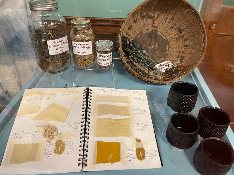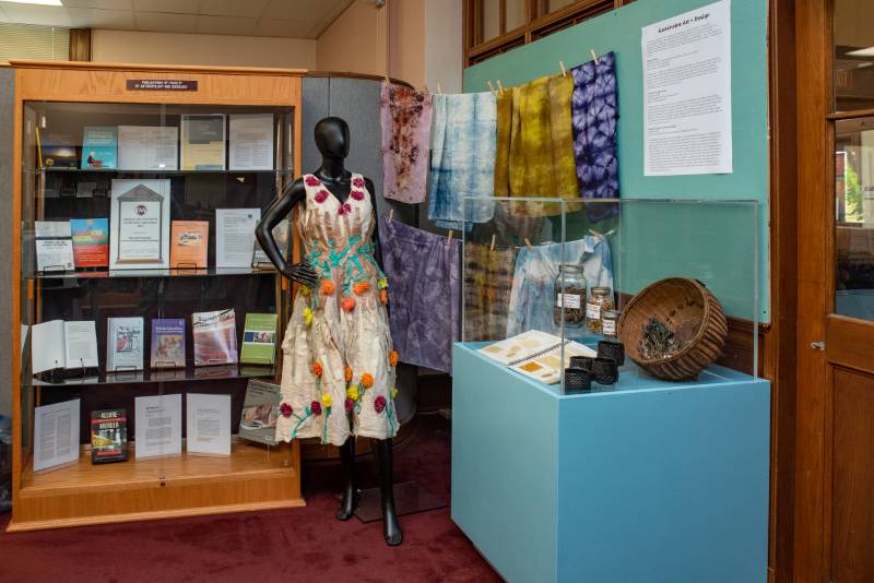 The Natural Pigments and Dyes Garden is a collaboration between the Department of Art + Design professor Kate Stewart and WCU Grounds Manager Josh Braid, and supported by an Office of Sustainability Research Grant. Located outside the E.O. Bull Center for the Arts, the garden is planted with Black-eyed Susans, Japanese Indigo, Woad, Lady’s Bedstraw and other plants traditionally used in the production of natural dyes and pigments. Students use the garden to learn about the influence of materials in art history. They also learn how to cultivate and harvest the plants in order to create natural dyes, pigments and art materials that they use in their own works. The work notebook, harvested plants, and dyed shirts on display are all products of the Natural Pigments and Dyes Garden.
