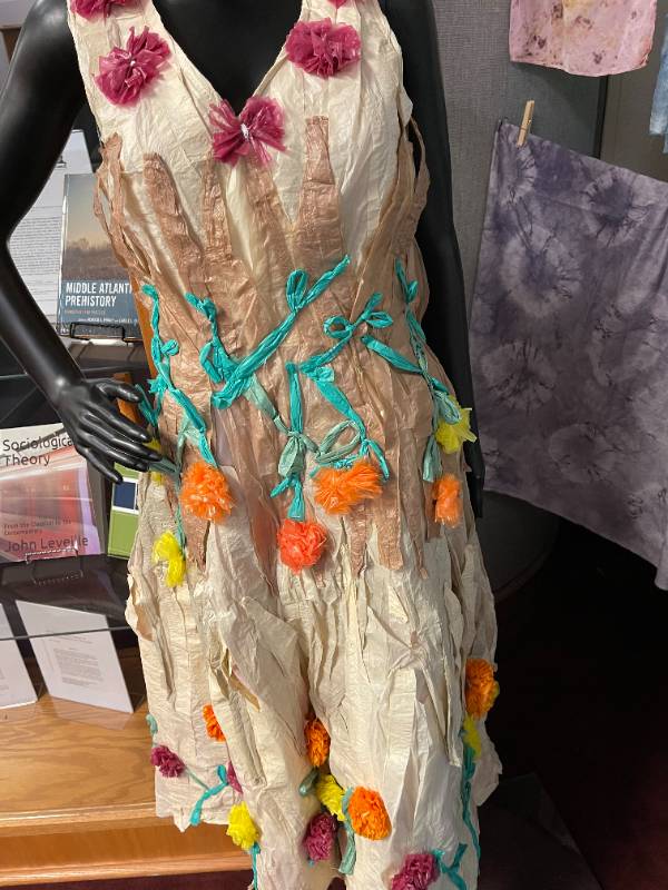 The Carnival of Ruin is a performance piece and exhibit of costumes and set pieces constructed entirely from post-consumer waste. The artists state that their goal is to present memorable visual imagery that empowers community action towards a better future. This dress is constructed from repurposed cloth and plastic bags to serve as a visual reminder of our social responsibility to consume less.