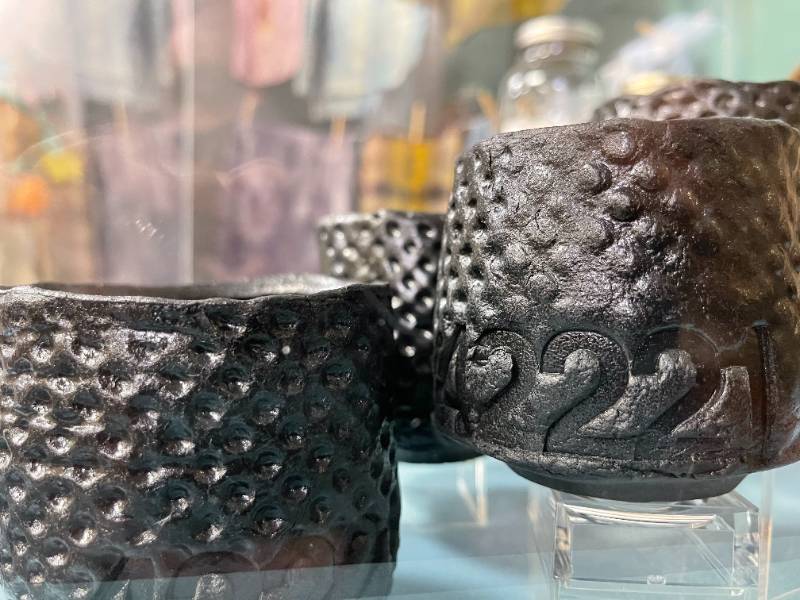 Pottery has the potential to be unsustainable, especially with the fuel consumption required for contemporary high-fire clay bodies. Andrew Snyder’s work has allowed him to develop a low-fire method that perfectly replicates the properties and color of high-fire pottery. These black porcelain cups, emblazoned with the date 4-22-21, were made exclusively for this exhibition.