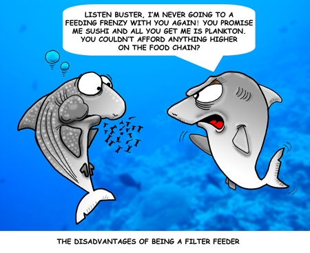 When the editor for the Journal of Experimental Biology asked me to do a cartoon on filter feeding sharks, it turns out that I had a cartoon on the subject ready to go. I added in a background of a coral reef from the work that I had performed on the island of Yap, while researching manta ray swimming.