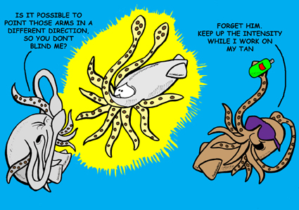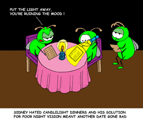 This cartoon was about night vision in some insects. It was rejected by the Journal of Experimental Biology, but it had a sentimental inspiration for me. My father hated restaurants with poor lighting. A candlelit table was unbearable. One time he pulled out a flashlight to read the menu. That was the last time we ate at that establishment.