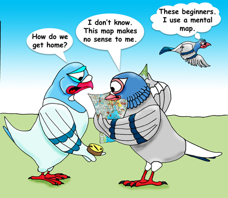 Another cartoon for the Journal of Experimental Biology on how pigeons use a mental map to know where they are going. The map is from the home lab of the authors of the article. See if you can figure out the city. Here is a hint....it is someplace in central Europe.