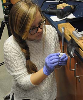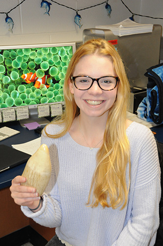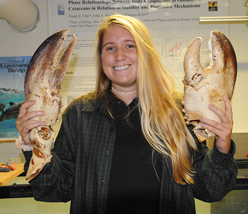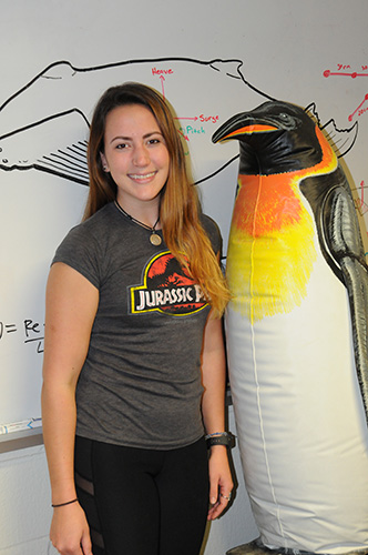 Kaitlyn Cardenas is an undergraduate research assistant in the lab. She has been collecting data on sea lion swimming and is currently working on modeling spin leaps by cetaceans of different morphologies. Her interests are toward an eventual career in dentistry, which explains the sperm whale tooth that she is holding.